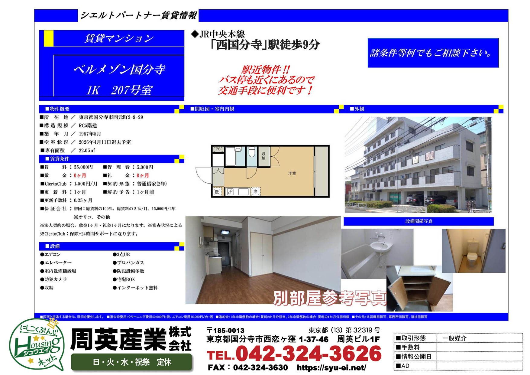 - JR中央本線国立駅 徒歩1500m 徒歩15分