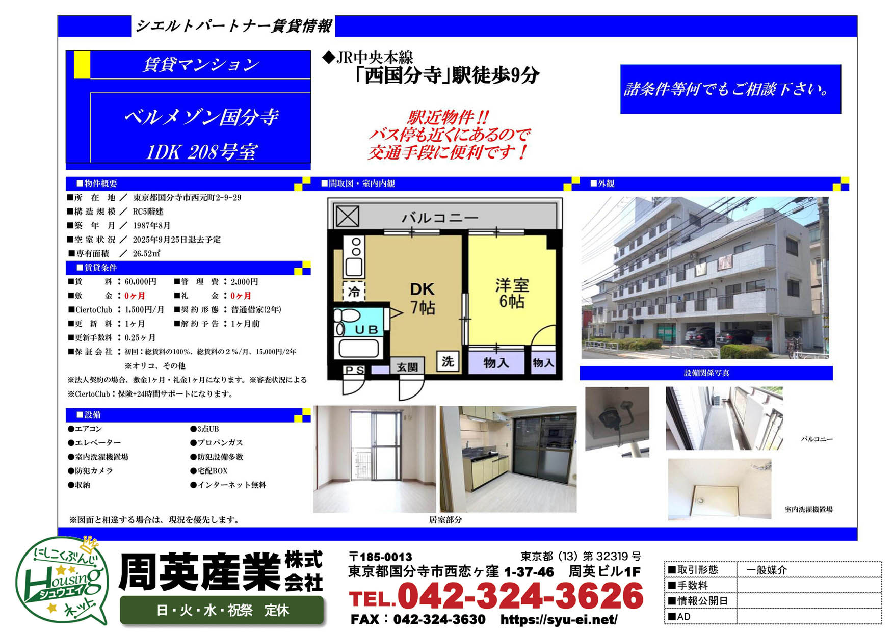 西武国分寺線西恋ヶ窪駅徒歩20分、中央線国分寺駅徒歩24分