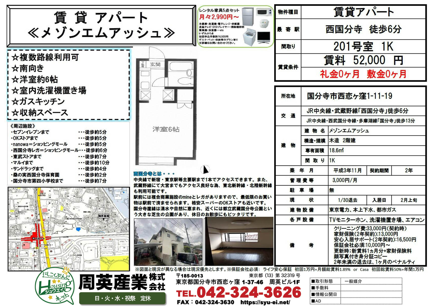 | 所在地 | 東京都国分寺市西恋ヶ窪1丁目 メゾンエムアッシュ |