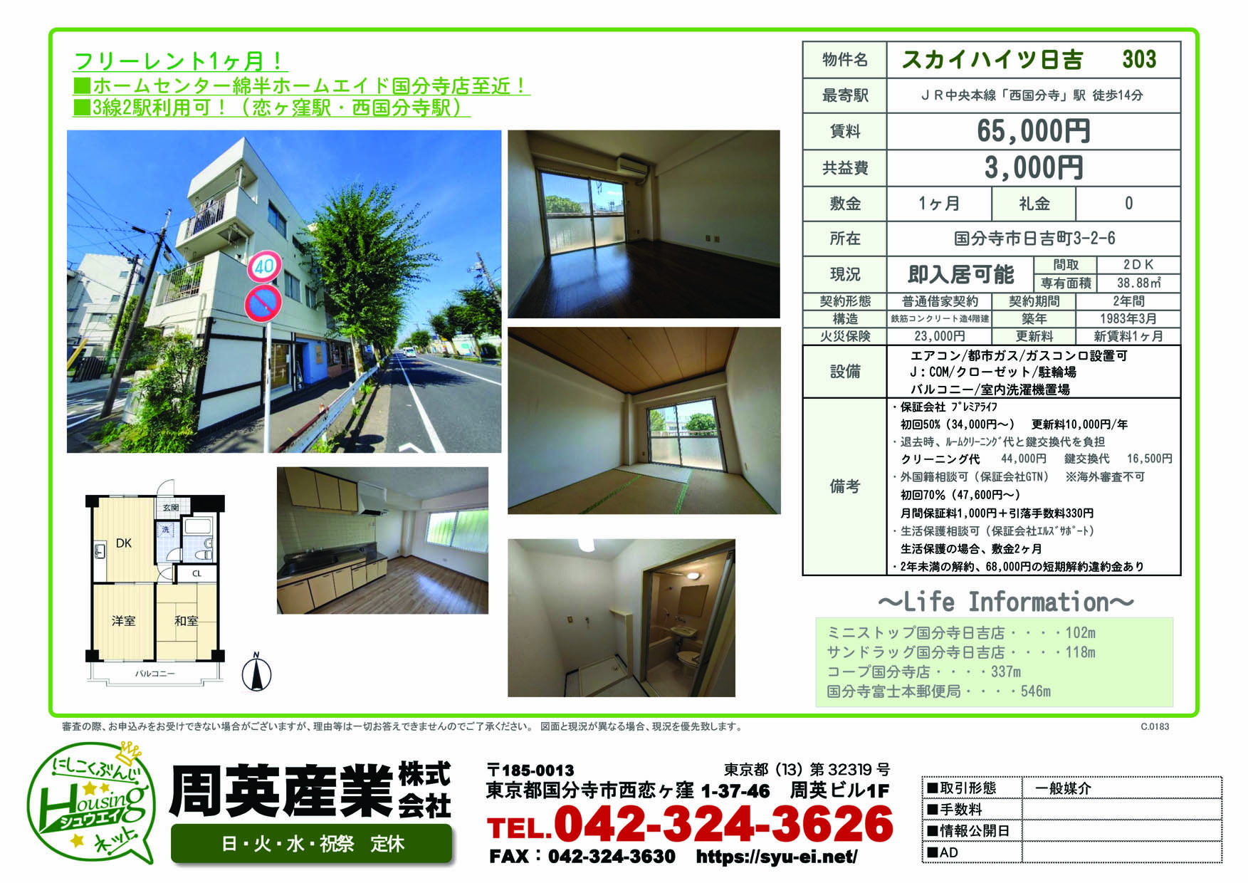 | 所在地 | 東京都国分寺市日吉町3丁目 スカイハイツ日吉 |