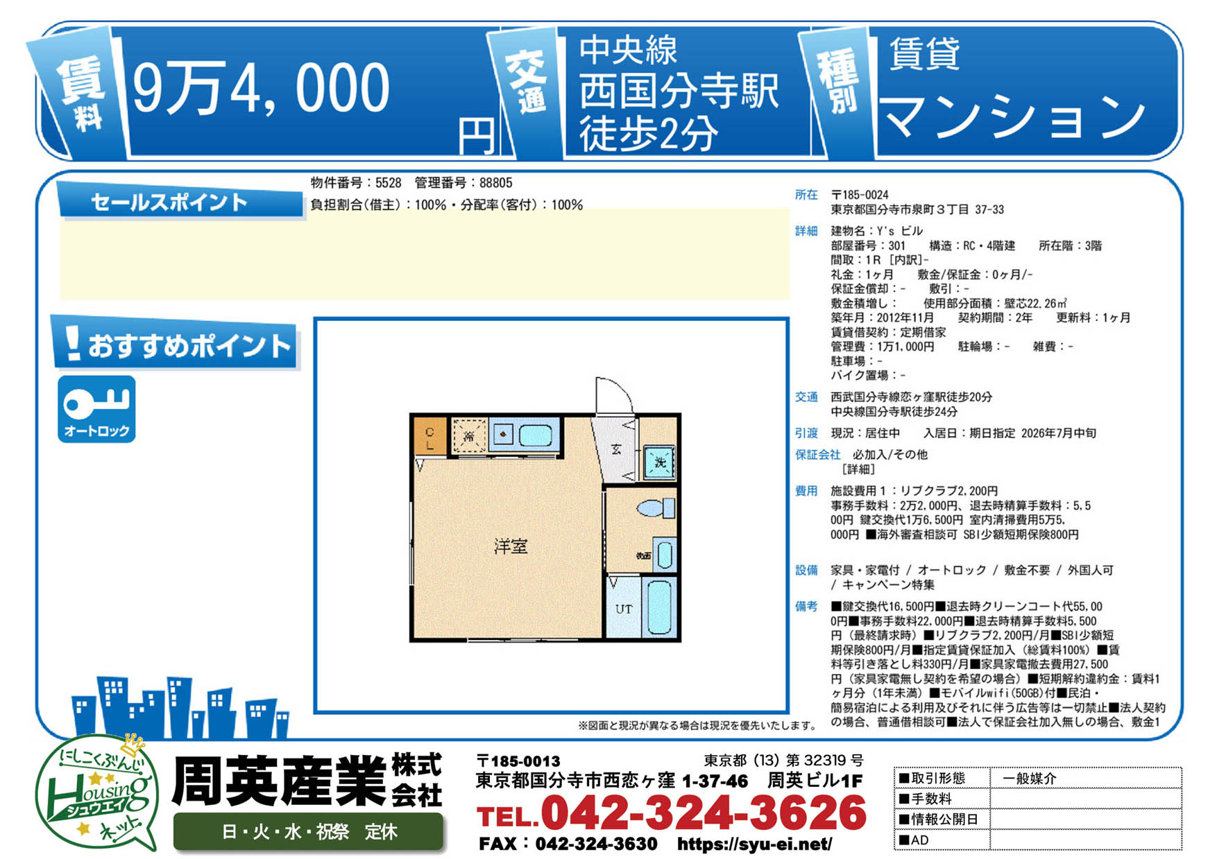 | 所在地 | 東京都国分寺市泉町3丁目 Y’sビル |
