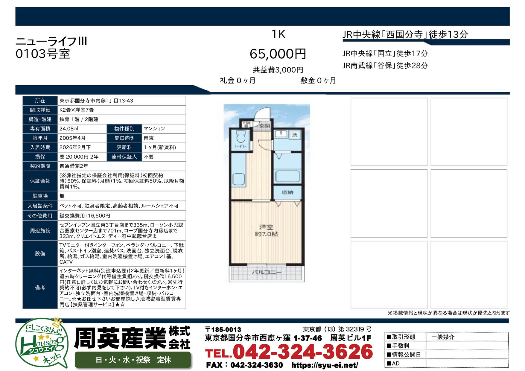 | 所在地 | 東京都国分寺市内藤1丁目 ニューライフⅢ |