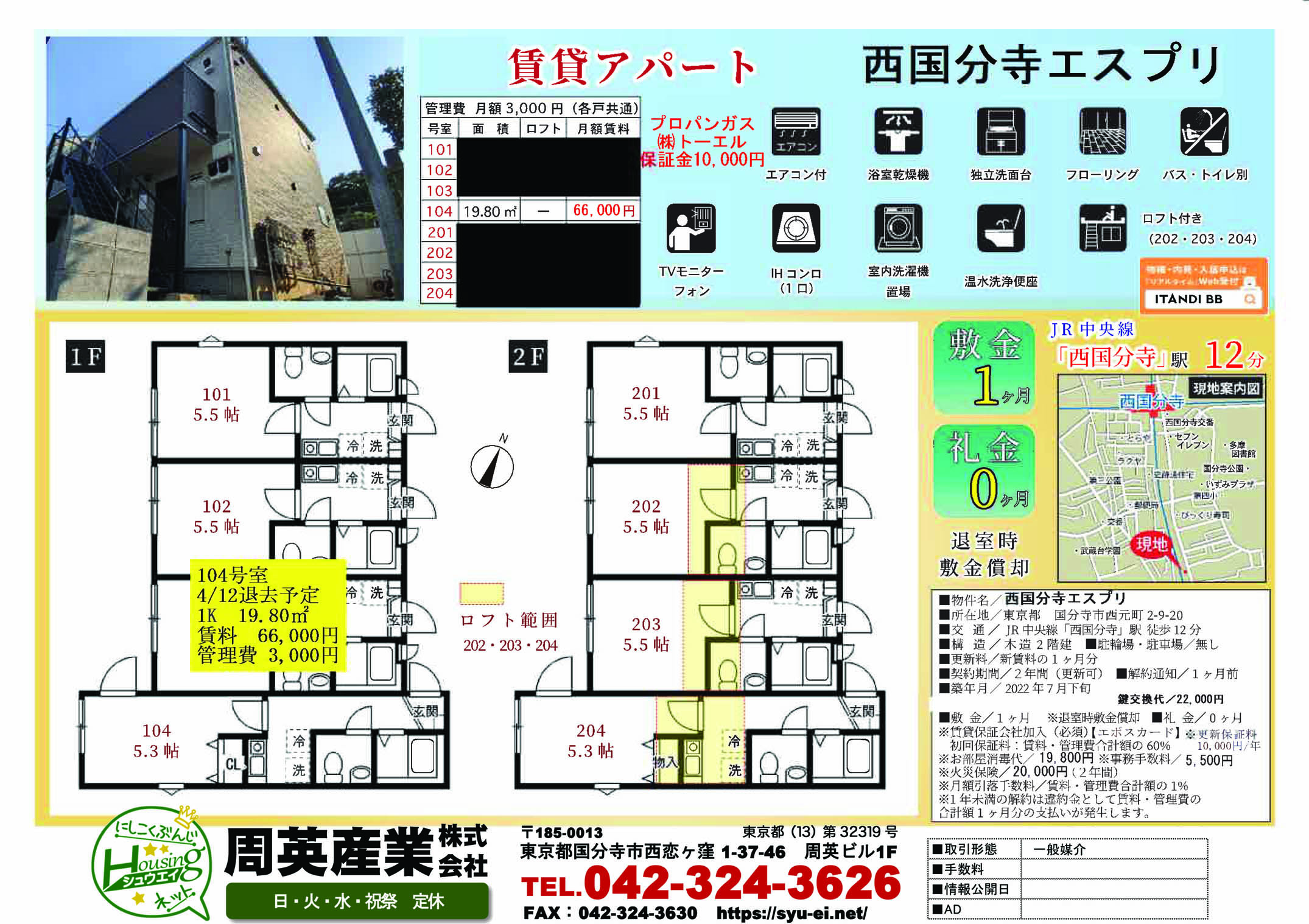 | 交通 | JR中央線西国分寺駅 徒歩12分 JR武蔵野線西国分寺駅 徒歩12分 |