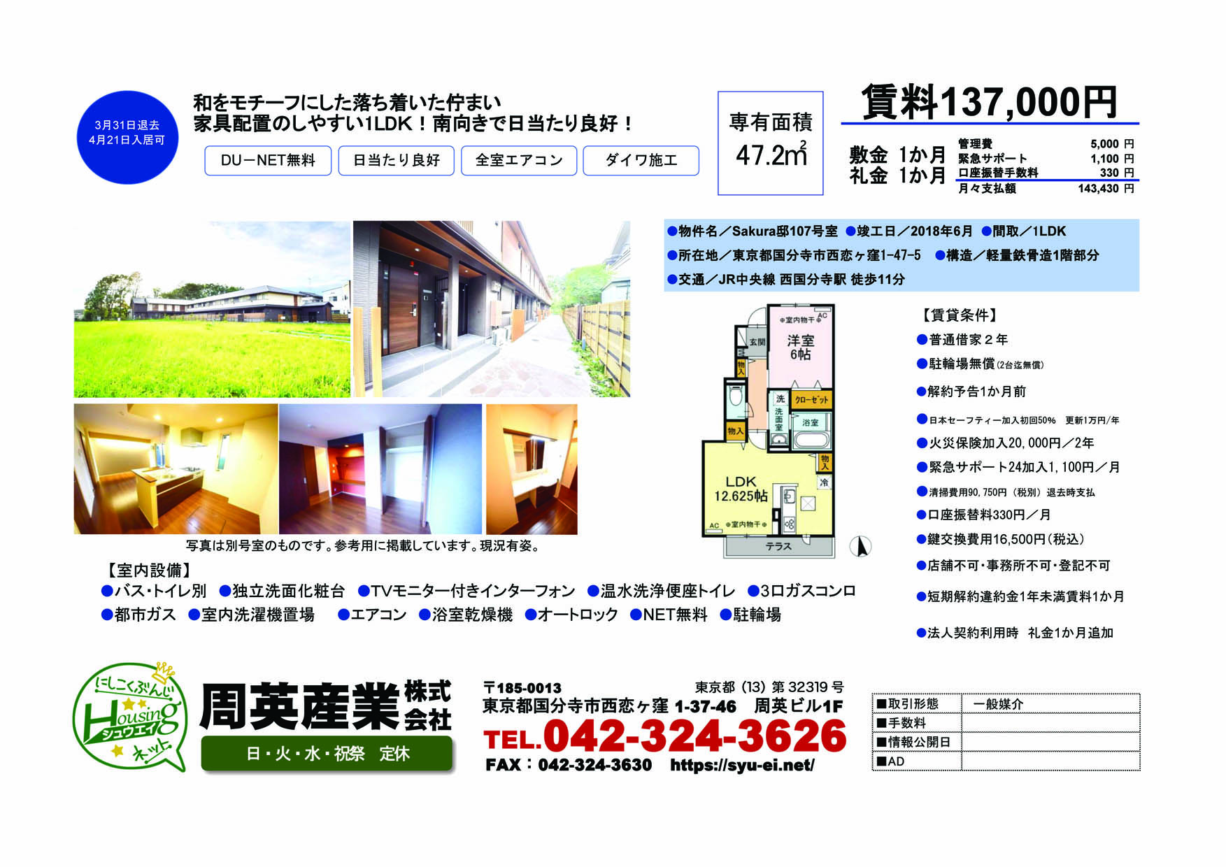 | 所在地 | 東京都国分寺市西恋ヶ窪1丁目 Sakura邸 |